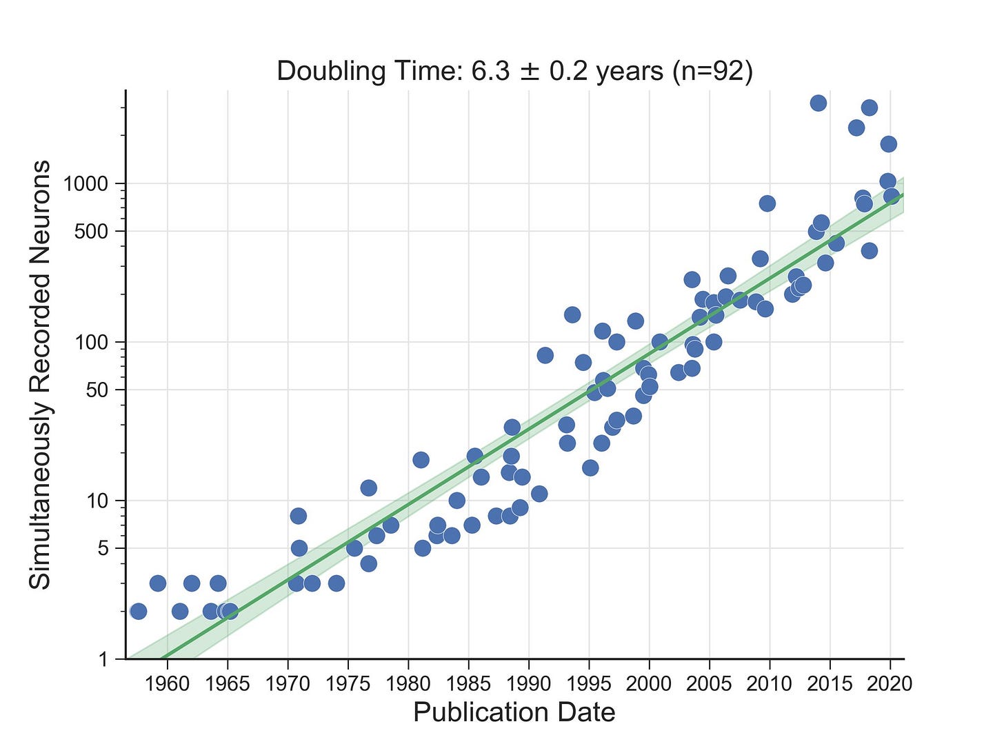 Over the last five decades, progress in neural recording has enabled the number of simultaneously recorded neurons to approximately double every 7 years, mirroring Moore’s Law.